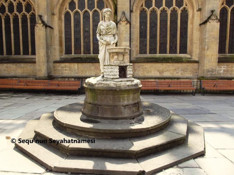 Bu bulunduğum teras gibi yerin etrafında ise 9 adet heykel var. Bunlar, Britanya ile bir şekilde bağlantısı olan imparatorların ve Romalıların Britanya’da görev yapmış valilerinin heykelleri. Devam edip yolun sonunda King’s Bath denilen yeri ve fokurdayan kaynak suyunu görebiliyoruz.