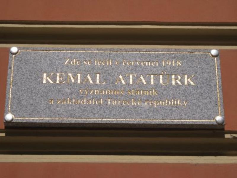 Atatürk’ün kaldığı Karlsbad Otel’in duvarına bir tabela ile Kemal Atatürk’ün burada kaldığı belirtilmiş.