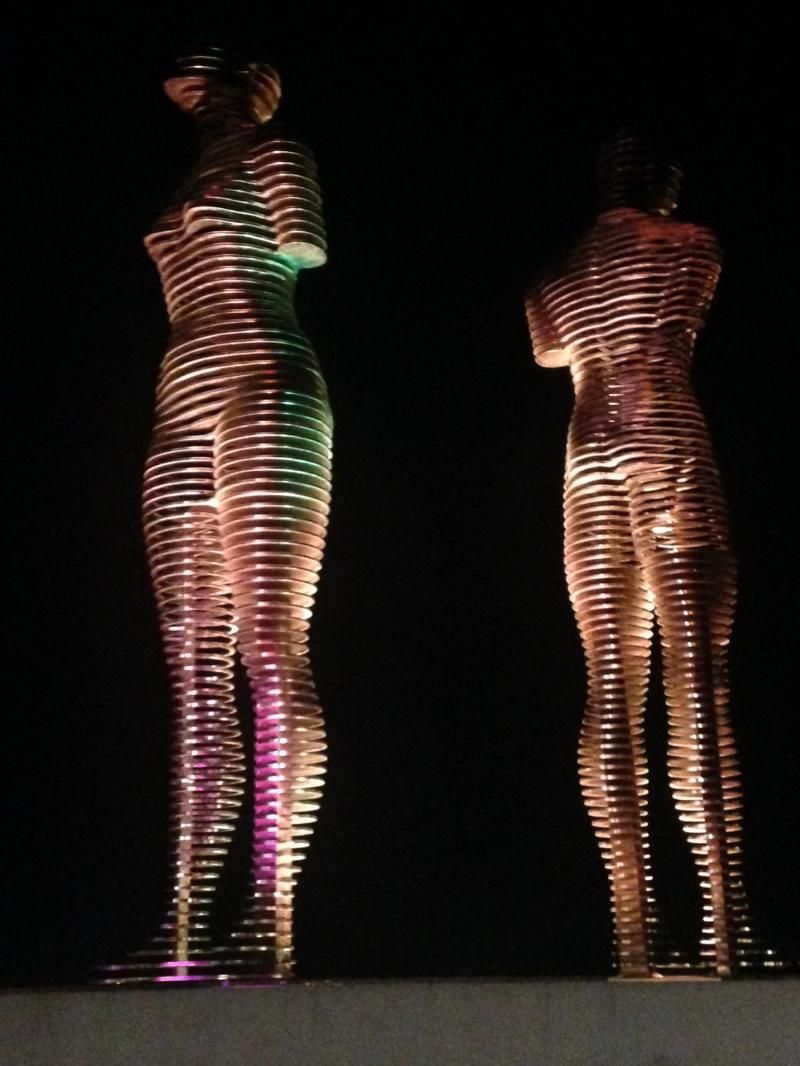 Tam da şu sıralar devam eden ve başrolünü dünyada Kanuni kadar tanınmış oyuncumuz Halit Ergenç ve ünlü Hollywood yıldızlarının oynayacağı bir film var. Kült yazar Kurban Said'in 33 dile çevrilmiş roman kahramanları Azeri delikanlı Ali ve cesur Gürcü kızı Nino'nun hüzünlü hikayesini ve ilginç siluetlerini izlemelisiniz sahilde. Metalden yapılmış birbirine tam kavuşacakken yine ayrılan bu hareketli heykeller belki aşkın dinler, ırklar ve zamanları aşan gücünü hatırlatacaktır size.