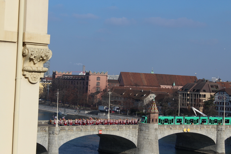 Biz de katedralin terasından etrafı izlerken kostümleri içerisinde Mittlere Rheinbrücke üzerinden Markt Meydanına yürüyen kalabalığı görüyoruz.