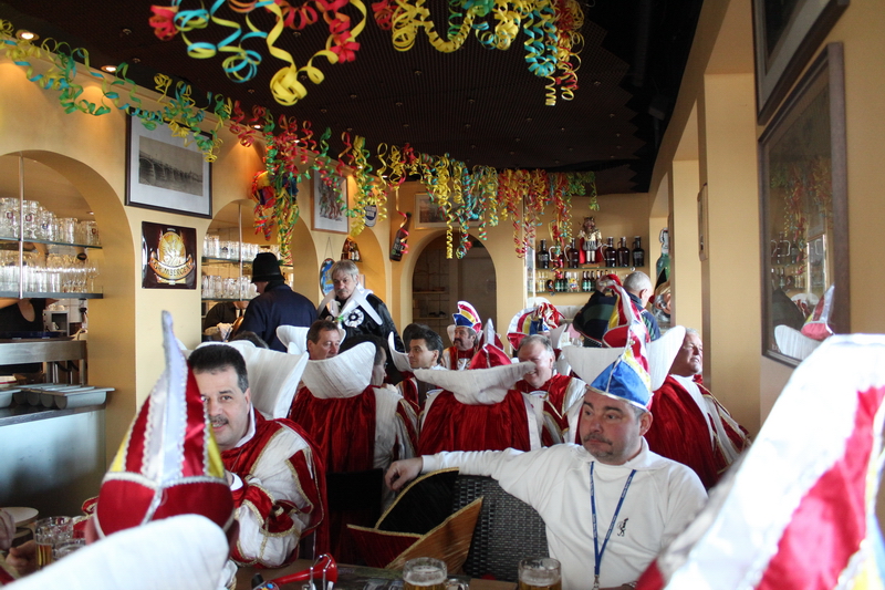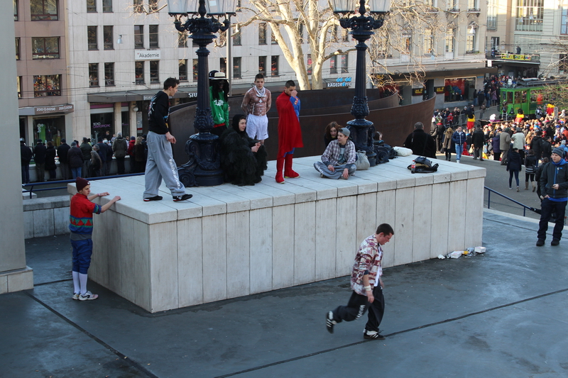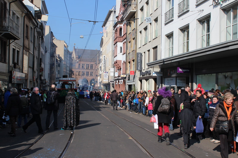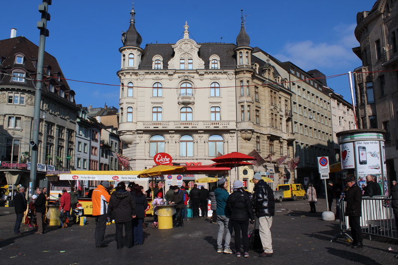 Karnaval geçidinin başlamasına az bir zaman kala Falknerstrasse’nin sonundaki Barfüsserplatz’da bir cafede oturuyoruz. Etraf çok kalabalık. Oturduğumuz yerden geçit törenini izleyebileceğiz.