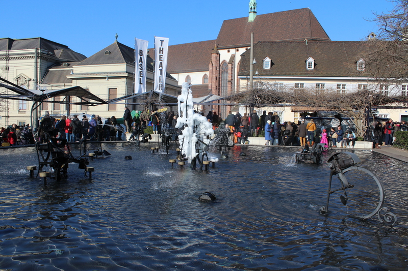 Ardından Theaterstrasse üzerinde yer alan modern mimariye örnek olan Stadttheather’e (Tiyatro binası) doğru yürüyoruz. Tiyatro binasının önündeki Jean Tinguely’in tasarımını yaptığı karnaval çeşmesi (Fasnachtsbrunnen) görülmeye değer bir yapıt. Mekanik aletler kullanılarak yapılan bu çeşme Basel’lilerin buluşma noktalarından biri. Çeşme suya tüküren 9 karakterin mizahi temsili ile oldukça dikkat çekici.