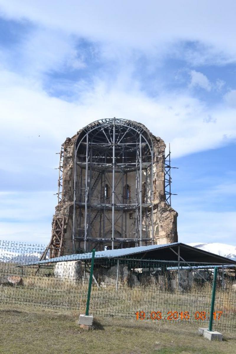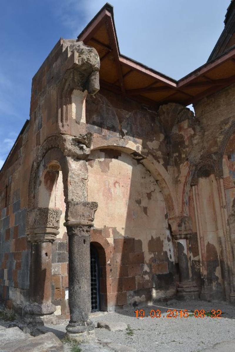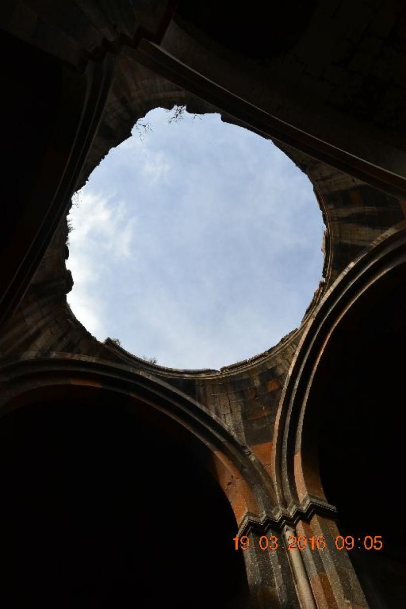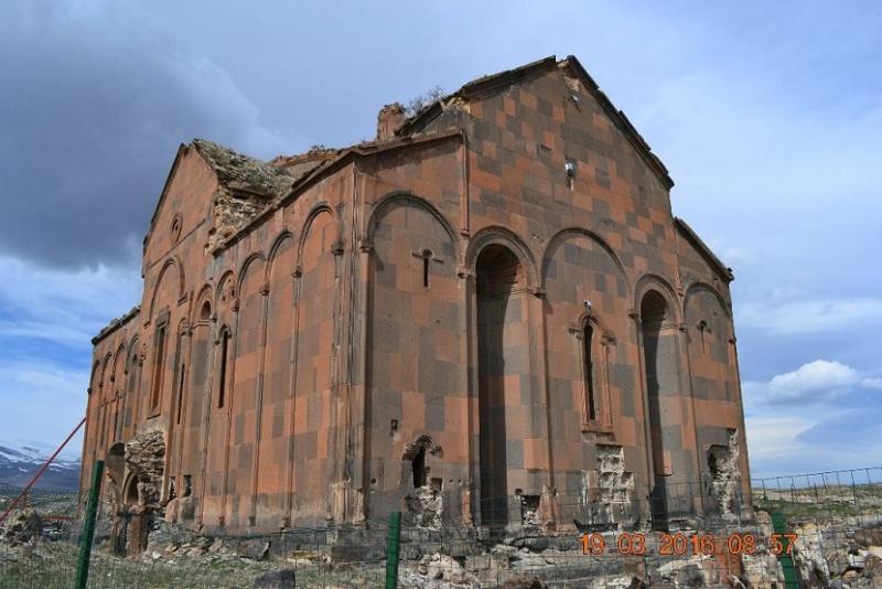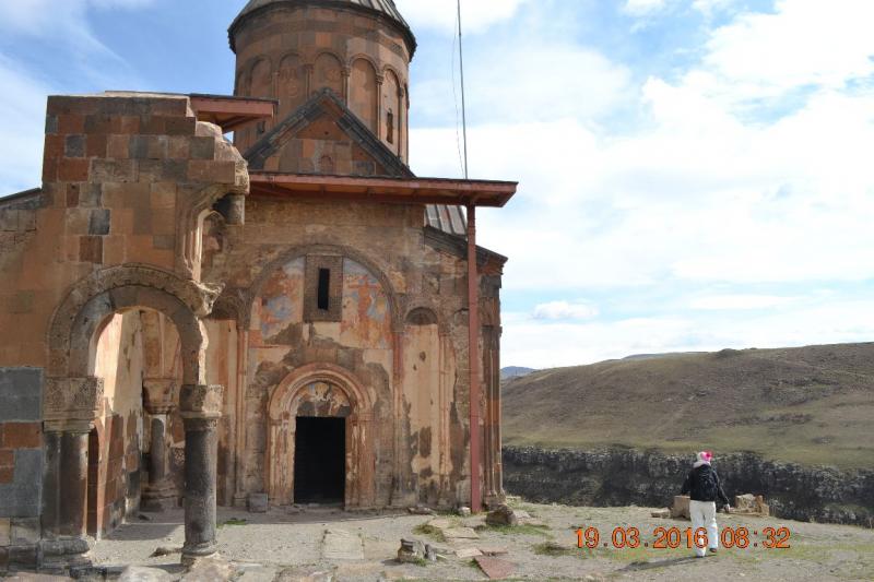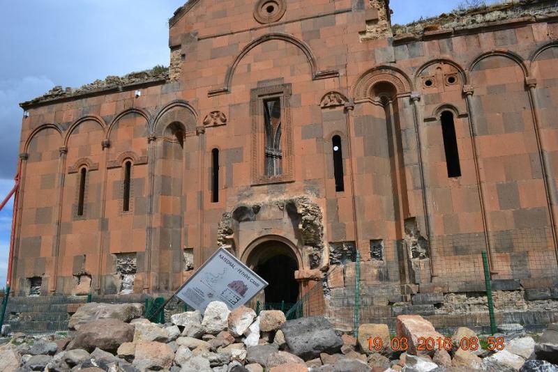 Ani Katedrali (Fethiye Camii) : Daha uzaktan yapının ne kadar görkemli olduğunu anlıyorsunuz. Düzgün kesme, tüf taşından inşa edilen kare planlı kilisenin orta mekanı örten kubbesi ne yazık ki yıkılmış. Giriş kapısının, kolonların güzelliği heybeti ise bambaşka. Yazıtlara ve tarihçilere göre kilisenin temelleri Bagratlı Kralı II. Sembat tarafından M.S. 990 yılında atılmış ancak Kral Sembat öldükten sonra kilise eşi kraliçe Katranide tarafından 10l0 yılında bitirilmiş. Kilisenin mimarı aynı yüzyılda İstanbul Ayasofya Kilisesi'nin tamiratını yapan TİRİDAT usta.