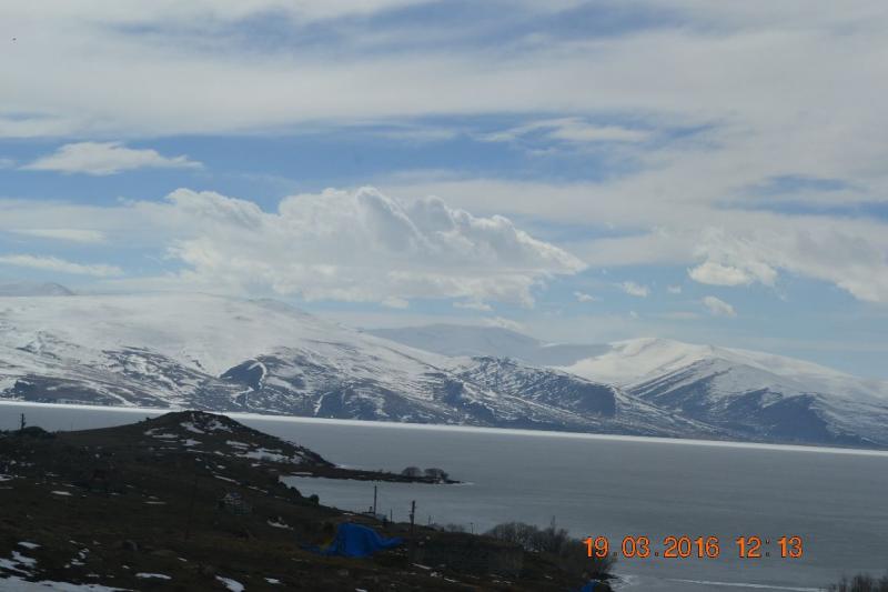 2000 metrede bulunan Çıldır Gölü, Türkiye’nin donan tek gölüymüş. Bulut fotoğrafları çekmeyi ve resmetmeyi çok seven biri olarak, karşıdaki karlı yüce dağlar ve hafif bulutlu ama masmavi gökyüzü harika manzaralar veriyor bana :) Ara sıra çıkan güneşin bulutlar arasından süzülen hüzmeleri ise tek kelimeyle harika, gölü bir başka güzelleştiriyor. Görüntüde biraz da yeşil olsaydı manzara tam olacaktı.