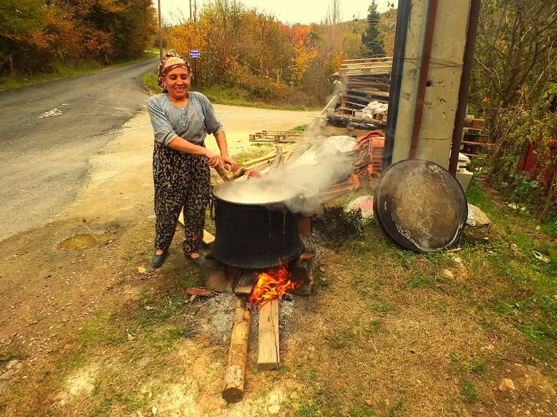 Köyü gezerken sokakta şeker pancarı pekmezi yapmakta olan bir köylü bacımıza rastladık. Flaşlar patlayınca daha önce böyle bir şey yaşamamış olmaması nedeniyle tedirgin oldu. Kendisinin ve pekmez kaynatma işinin bizim için önemli bir fotoğraf karesi olduğunu anlayınca da gülümseyip poz vermeye başladı.