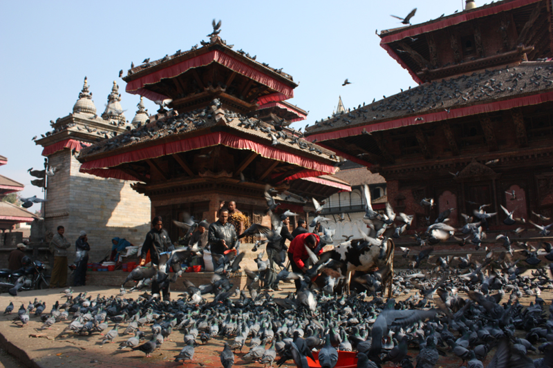 Bu bölgedeki en önemli yapılar Akash Bhairav Tapınağı ve Bhagawati Tapınağı. Ancak bunların yanısıra bu meydanda pek çok irili ufaklı tapınak mevcut. Kuşlar, köpekler, inekler, insanlar, sokak çalgıcıları, Sadular’ı ile burası çok renkli bir mekân.