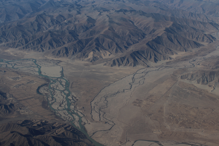 Himalaya’ların kârlı zirvelerinden biraz aşağıya inerken karlar bitiyor ve üzerinde yüksek rakımdan ve oksijen azlığından dolayı hiç bir çalılık, yeşillik, ağaç olmayan yüksek dağları görüyoruz. Tibet’in yüksek platoları boyunca ilerledik. Aralarda akan ırmak ve nehir kenarlarında bile hiç yeşillik yok. Çok ilginç bir doğa. Çırılçıplak bozkır dağlar arasında gümüş bir tel gibi kıvrılan nehirler.