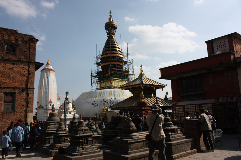 Tepeye ulaştığımızda büyük bir Stupa karşılıyor bizi. Bu stupa Nepal’in en büyük Stupası olan Boudhanath’ın biraz daha küçük versiyonu gibi. Bu stupanın da üst tarafı yani çatı kısmı yarım küre şeklinde ve beyaz. Çatının üzerinde yine altın renkli ve kare biçiminde bir bölüm var. Karenin 4 tarafında yer alan ikişer göz ise yaratanın her yönü ve herşeyi gördüğünü simgeliyor. Bu stupanın tepesinden de aşağıya kadar uzayan renkli dua bayrakları var. Buradaki Stupa’nın 2 bin yıllık olduğu düşünülüyor. Stupanın çevresindeki manileri çeviren çok sayıda kişiyi görüyoruz.
