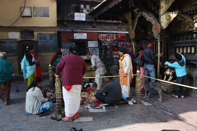 Stupa’nın çevresinde Budistler mantralarını okuyarak dolaşırken, Hint Tapınağı’nın önünde Pandit eşliğinde dualar okunarak, tapınağa yiyecekler, çiçekler ve hayvanlar sunuluyor.