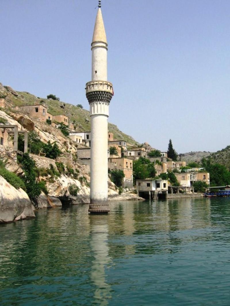 Kıyıda sıralanmış lokantalar ve tekneler gelen turistleri beklemekte. Bayağı rağbet var!!! Kalabalığın kimisi yemek, kimisi gezme derdinde... Biz önce gezmeyi tercih edenlerdeniz. Bir motorla anlaşıp yola çıkıyoruz. Motor kıyıdan yavaş yavaş ilerliyor. Rehberimiz, sular altında kalan bölümleri gösteriyor bize. Köyün alçakta kalan bir kısmı suyun altında kalmış. Anlattıkça, duygulanıyoruz! Bölge halkı; sular altında geçmişlerini, çocukluklarını, anılarını bırakıp, başka yerlere göç ediyorlar.
