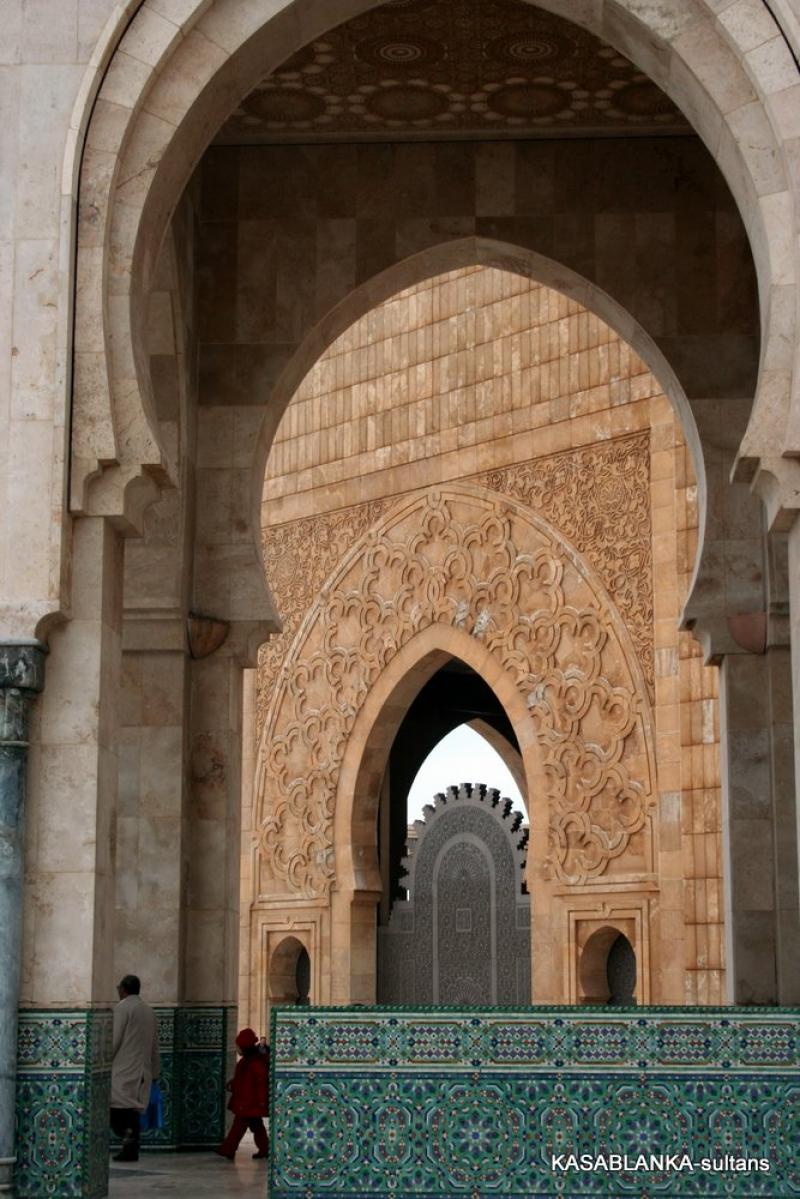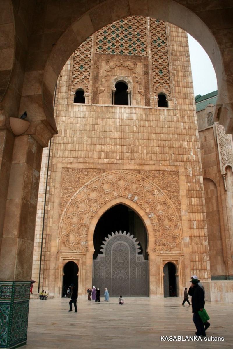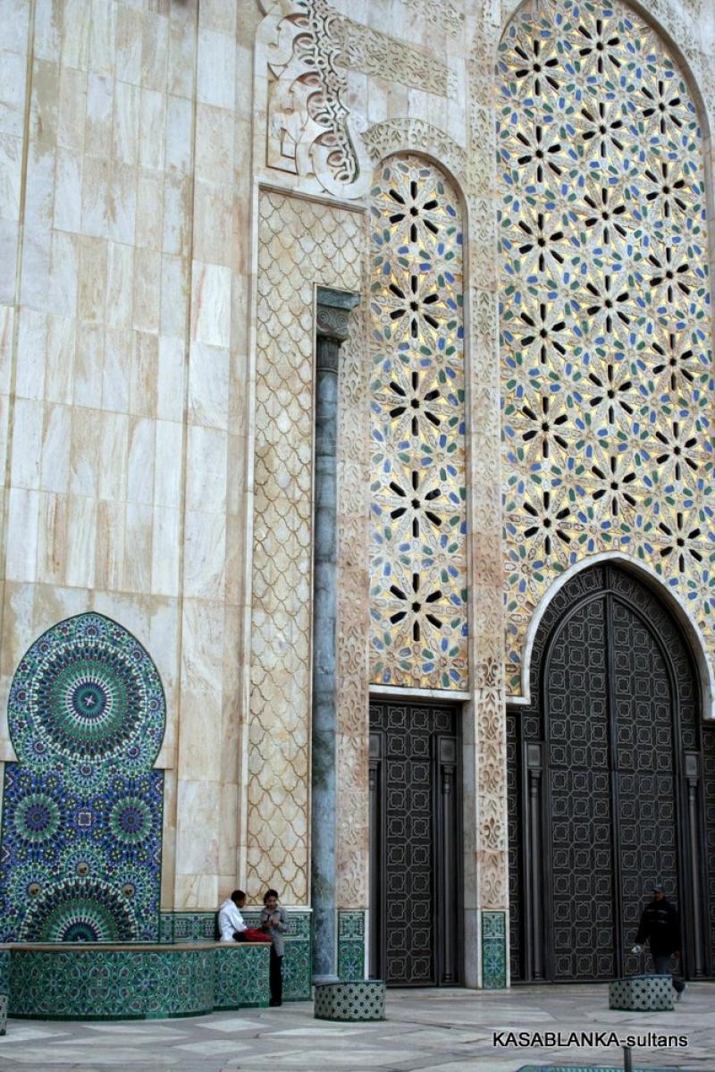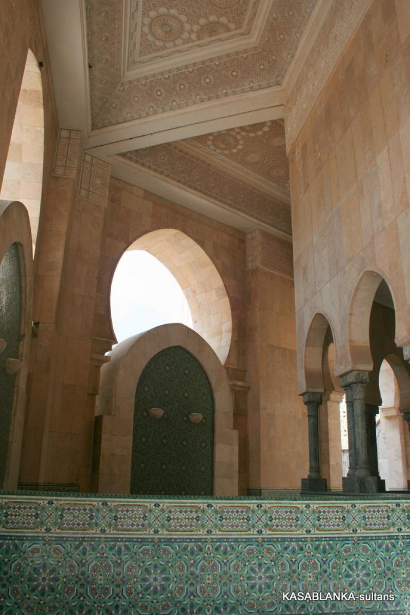 Ama bu muhteşem camiye öyle elinizi kolunuzu sallaya sallaya giremiyorsunuz. Malum ibadet için yalnızca Müslümanlar girebilir. Yabancılar ise rehber eşliğinde izin verilen saatlerde camiyi gezebilir. Ayrıca kadınların sadece kadınlar girişinden kadınlar mahfiline girmesine izin veriliyor. Oradaki tahta işlemeler arasından camiyi görebiliyorsunuz. Buna rağmen 2. Hasan Camiinin gerçekten çok büyük, güzel ve oldukça incelikli, zarif bir mimari yapı olduğunu söyleyebilirim. İçi tavanından tabanına bir sürü inceliklerle bezenmiş ki dış yüzeyi de aynı oranda inceliklerden nasibini almış.