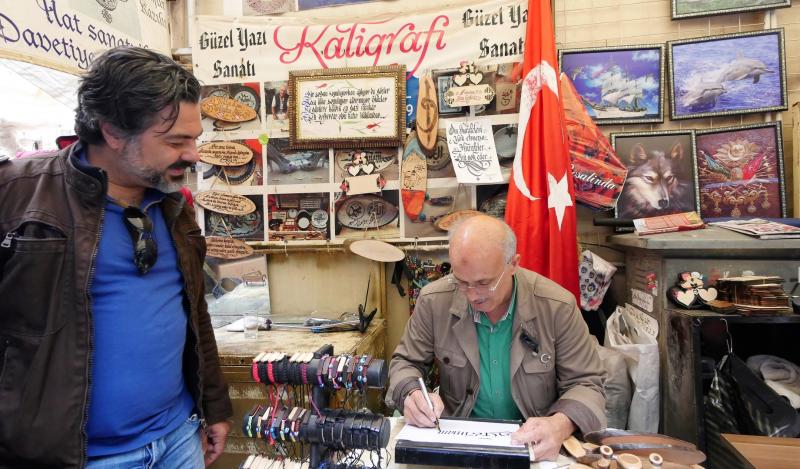 Kızlarağası Hanı’nın hem içini, hem çevresini keyifle geziyoruz. Tuğçe ve Can için bu bir keşif, benim için ise 1990’ların başında restore edildiği dönemdeki popülerliği nedeniyle öğrencilik dönemlerime bir nostalji oluyor bu ufak gezinti. Hisarönü Camii’nin önünde tespihçiler vardır. İşte bunların bir tanesinin yanında, tam köşeyi döndüğünüzde de meşhur bir hattat: Hisar Kaligrafi’nin hat ustası Hamza Gönül. Kendimizi tanıttığımız sırada o günlüğüne işi kapatıp evine gitmek üzereymiş. Ama bizi ağırlamayı ihmal etmiyor ve itirazlarımıza rağmen hemen dükkanı tekrar açarak bize “Gezimanya” isminin bugüne kadar en güzel yazılış şekline hediye ediyor. Bu müthiş yazıyı hala ofisimizde saklıyoruz.
