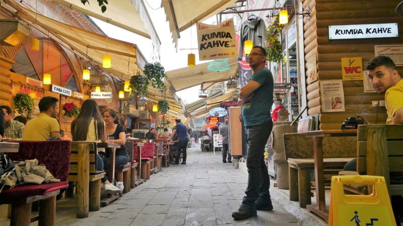 Bu kadar gezmenin sonu tabi ki yorgunluk. Ne yaptığımızı tahmin ediyorsunuz değil mi? Tabi ki Kızlarağası Hanı’nın duvarlarının dışında, Hisarönü tarafında bir soluk alıp kumda Türk kahvesi söyledik kendimize. Burada bir sıra enfes kahveci var. Bize Osmanlı şerbetleri de ikram ettilerse de bizim favorimiz yine kumda ağır ağır pişmiş, okkalı Türk kahvelerimiz oldu. Tabi burada ben rahat durur muyum? Asla!