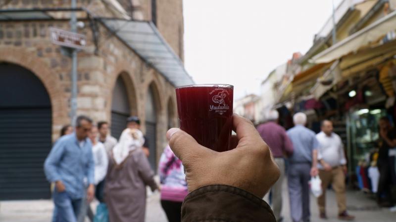 Kemeraltı’nda ilk lezzet durağımız tabi ki Yudumla Şerbetçisi. Tuğçe’ye burada karadut şerbeti içirmezsem yıllardır başının etini yiye yiye anlattığım hikayelere haksızlık etmiş olurum. Sonuç? Çok beğenildi! Kısa şerbet molasının ardından Kemeraltı’nda iyice derinlere iniyoruz. Hala yaşlı amcaların girişindeki musluklarda abdest aldığı Şadırvan Camii ve Kızlarağası’na doğru geçişte bir kez daha uğrayacağımız Başdurak Camii'nin önünde fotoğraflar çektikten sonra hedefimiz tarihi hanları keşfetmek. Burada hem belediye, hem de bölge esnafının çabalarıyla güzel hamleler yapılmış ve eski hanlar birer birer daha keyifli mekanlara dönüştürülmeye başlanmış..