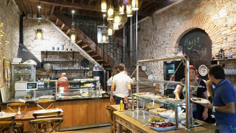 İşportacı tezgahları ve sokağa dizilmiş mankenlerden oluşan geniş tekstil dükkanlarının arasında kendinizi birden bu hanın girişiyle karşı karşıya bulacaksınız. Arkanız Konak Meydanı'ysa sağınızda kalacak şekilde bu girişten içeri seğirtirseniz işte bu manzarayla karşılaşacaksınız. Bir süre önce hiç kullanılmayan bu han güzelce restore edilmiş ve içine de çok keyifli restoranlar, kafeler açılmış. Biz de bunların bir tanesinde yiyoruz yemeğimizi: “Ayşa”. İşte bu fotoğrafta kendisini de görebileceğiniz Ayşe Hanım bir Boşnak göçmeni. Son derece kendine güvenli, bu restorasyonu yüksek bir bilinçle yapmış, kendisini Kemeraltı’nın değişiminde öncü gören, pırıl pırıl bir İzmir kadını Ayşe Hanım. Yemekleri de inanılmaz güzel. Mantı, Boşnak böreği ya da et yemeği söyleyebiliyor ya da elinize bir tabak alıp açık büfe zeytinyağlıların tadına bakabiliyorsunuz. Müthiş!