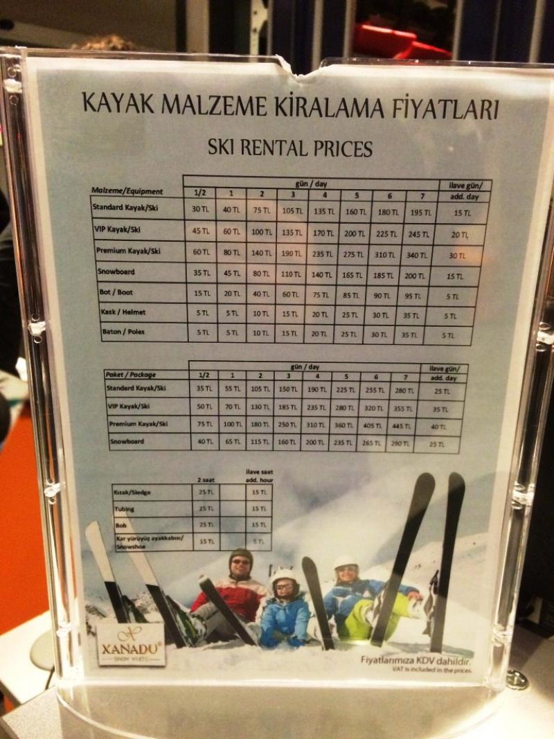 Eğer yanınızda kayak takımlarınızı götürmediyseniz Snow Plus'tan bu ekipmanları kiralayabiliyorsunuz. Otelde kayak kıyafeti kiralanmıyor bunun için yine otel size yardımcı oluyor ve Polat Otel’den kıyafet kiralayabiliyorsunuz. Snow Plus'taki kayak kiralama ücretleri ise şöyle: