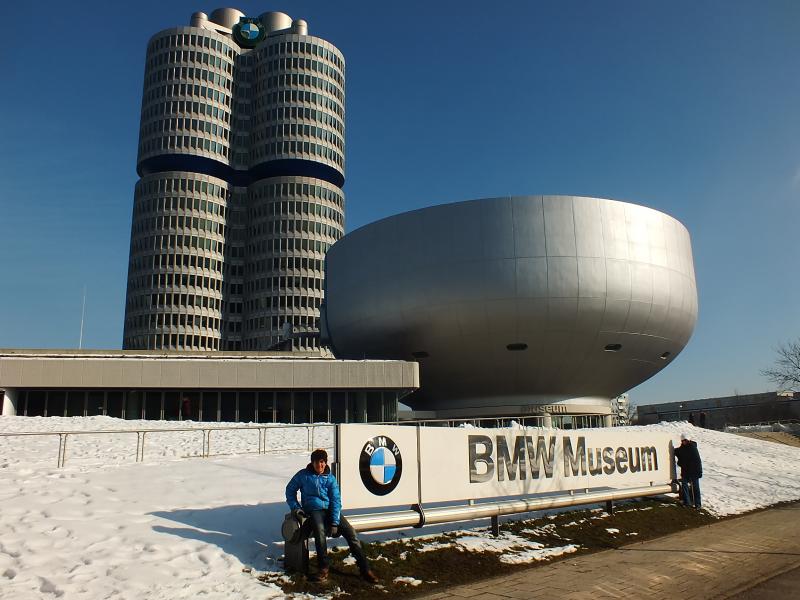 BMW Dünyası ile BMW Müzesi’ni bir yol ayırıyor. BMW iki yerleşkesini gümüş rengi, şekilli bir köprü ile birbirine bağlamış. Biz de köprüyü kullanarak BMW Müzesi’nin önüne geldik. Bu yapı yarım küre şeklinde. Arka tarafta görülen 4 silindirli bina BMW'nin merkezi, karşısında ise BMW'nin fabrikası var. Bütün bu kompleksi tanıtım amacıyla 1972 Olimpiyatları'na yetiştirmişler. Müzeye giriş ücreti tek kişi için 10 €, aile 24 €. Dikkat müzeye sırt çantası almıyorlar. Girişte dolaplar var. Oraya kilitlemenizi istiyorlar.