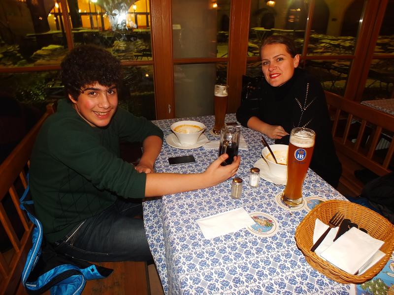 Gelelim yemeklere; önden domates çorbası, arkasından sığır eti füme, kızarmış tavuk alabilirsiniz. Özellikle patates püresi ile servis edilen kızarmış tavuğu tavsiye ederim çünkü tadı bizim tavuklara hiç benzemiyor. İçecekler ise sizin tercihinize kalmış. İçerisi bayağı kalabalık, yer yok. Bu nedenle garsonlara bize “4 kişilik yer lütfen” demenizin hiçbir önemi yok. Zaten sizinle ilgilenebilecek durumları da yok. Bu nedenle bulduğunuz yere oturun. Herkes bunu hoş karşılıyor. Buradaki garsonlarla Almanca yerine İngilizce konuşmanızı tavsiye ederim. Çünkü Almancaları hiç anlaşılmıyor.