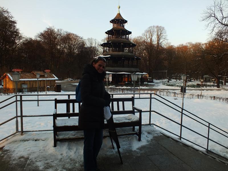 Eğer İngiliz Bahçesi'nde yemek yemek için fiyatları uygun ve ağız tadımıza göre bir yer arıyorsanız Gaststätte Chinesischer Turm yani Çin Kulesi Lokantası tam size göre. Kış olduğu için park içerisinde yemek yiyebileceğiniz fazla seçeneğiniz yok. Bizim belediyeye ait sosyal tesislere benziyor ancak daha iyi hizmet vereni. Menüde klasik Bavyera yemekleri sunuluyor. Biz sadece yerel yemek deneme amaçlı olarak Bavyera Köftesi aldık. Bir avuç ekmeksiz kıymayı mühürleyip önünüze getirdiklerini düşünün. İşte öyle bir şey. Almanların acilen bizim köftelerle tanıştırılmaları gerekiyor. Tatlı olarak da genelde apfelstrudel yani elmalı turta yiyorlar. Ünlü olduğu Avusturya'dan farkı bunu çok sıcak sunmaları.