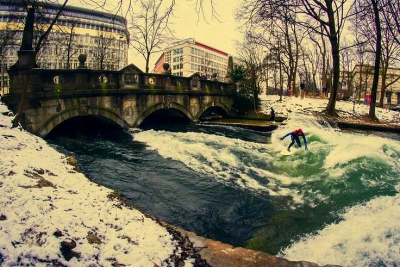 Parkın güney kısmında, rastlamayı hiç ummadığınız bir spor faaliyeti ile karşılaşacaksınız: Sörf. Eisbach Kanalı, Münih'in can damarı olan Isar Nehri'nin bir kolu olarak insan eliyle yaratılmış. Bu kanalın ağzında yer alan yapay akıntı üzerinde sörf yapmak için ellerinde sörf tahtaları ile bekleyenler ilginç bir manzara oluşturuyor. Diğer tarafta ise şu an üzerinde bulunduğumuz köprü üzerinde bekleyen fotoğrafseverler bekliyor. Her gün burada fotoğrafsever kalabalığı köprüden fotoğraflarını çekerken, sörfçüler de tabii ki ayakta kalabildikleri ölçüde güzel pozlar vermeye çalışıyorlar. Münih ile ilgili anlatacaklarım bu kadar. Münih'i genel itibariyle bütün hatlarıyla anlatmaya çalıştım. Gerçekten çok güzel bir şehir. Şehri tam olarak gezip anlayabilmek için en az 5 gün burada kalmanız gerektiğini değerlendiriyorum.
