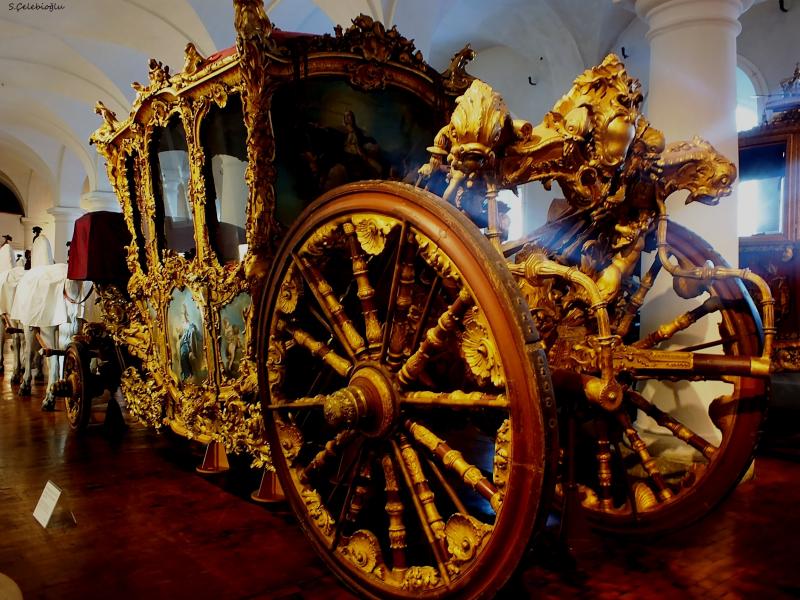 İşte ünlü Bavyera Kralı Ludwig II'nin arabası. 1721-1886 arasında kraliyet tarafından kullanılmış. Hakikaten inanılmaz bir işçilik var. Arabalara ve süslemelere bakılınca o dönemde de lükse ve gösterişe düşkünlük göze çarpıyor. Görülen araba 1780 model. 8 at bu arabayı çekiyor. Animasyon filmlerinden çıkmış gibi. Bu arada görülen sarıları devamlı parlatan uzmanlara rastladık. Meğerse bu sarı parlatma işi sadece biz de yokmuş.