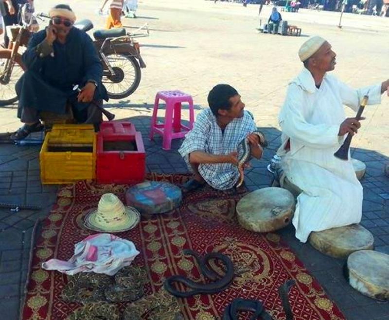 Meydanda yılan oynatıcıları ve dans eden yılanlar, maymun terbiyecileri ile boynunuza atlamaya hazır sevimli maymunlar, açık hava pazarı, seyyar satıcılar, hediyelik eşya satan dükkânlar, baharatçılar, geleneksel kıyafetleri ile su satıcıları, dövmeciler vb. bulunuyor. Yalnız şunu belirtmeliyim ki meydandaki satıcılar oldukça ısrarcı! Gözünüzün ucuyla olsa dahi bir şeye bakmayagörün, eğer yakalarlarsa kurtulmanız çok zor… Fotoğraf çekerken bile dikkatli olmanız gerekiyor. Hemen gelip para istemeye hazırlar… Bu arada ansızın yanınızda bir kadın belirip kolunuza yapışarak “henna henna” nidaları eşliğinde elinizi boyamaya koyulabilir. Eğer dövmeden hoşlanıyorsunuz, değişik motif ve fiyat seçenekleriyle kına ile geçici dövme yaptırabilirsiniz.
