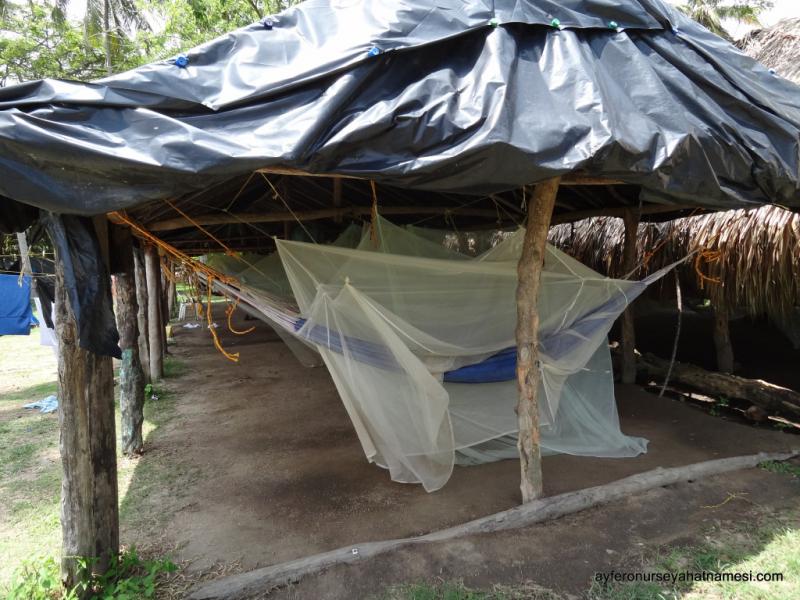 Açık alandaki restoranın her tarafından yağmur suları akmaya başladı, hepimiz restoranın ortasında toplanmaya başladık. Isabelle ve Christian, oturdukları masa kuru olduğu için bizi yanlarına davet etti. O sırada çok yakınımıza ormanın içine bir yıldırım daha düştü. Herkes panik halde fırtınanın dinmesini beklemeye başladı. Neyse ki yemeklerimizi yedikten sonra yağmur yavaşlamaya başladı. Bu sırada tabii ki her yer batak vaziyette ve çadırların durumu merak ediliyor. Hemen çadırları kontrol ettik ve birçok çadırın içlerinin ıslanmış olduğunu ve bizim çadırın da yatılamayacak durumda olduğunu gördük. Görevli kimse yok, olsa da İspanyolca olarak derdimizi anlatma şansımız yok. Isabelle ve Christian’ın tavsiyesi hamak oldu ve bir görevli bulup derdimizi anlattılar. Boş iki hamak ayarladılar ama bu sefer de hamaklardan biri ıslak diğeri nemli çıktı. Ne yapalım derken herkes yavaş yavaş restorandan ayrılmaya başladı ve eşimle biz tek başımıza kaldık. Geceleri plaj yengeçlere kalıyor hani havlumu atayım biraz kestireyim deme şansınız da yok. Bir taraftan da hava iyice serinlemeye başladı, yanımıza yağmurluklarımızı almadığımıza pişman olduk. Birkaç saat de olsa uyuyabilirsek diye hamaklarımıza geri döndük ve havlularımıza sarılıp uyuduk. Sabah gün doğmadan kalkmıştık direkt kendimizi plaja attık ama yengeçler henüz plajı bize bırakmamıştı. Denizi biraz daha bozulmuş, dalgalı ve yosunlu görünce, üstüne üstelik hava kapalı olunca ikinci geceyi geçirmemeye ve Santa Marta’ya geri dönmeye karar verdik. Aynı şekilde bir gece daha geçirme olasılığını bile göze alamadık.