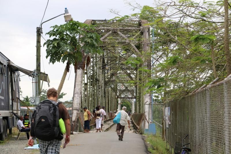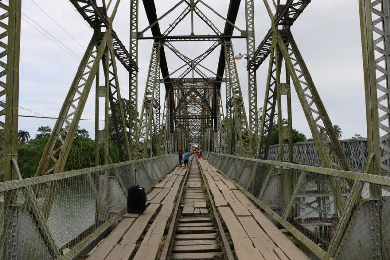 Sixaola Nehri, Kosta Rika ve Panama’yı ayırıyor. Üzerinde de yaklaşık 400 metrelik derme çatma bir köprü var. Köprü üzerinde bir de tren yolu yer alıyor. Valizler elimizde diğer tüm turistler gibi bizde köprü üzerinde yürüyerek Panama sınırına geliyoruz.