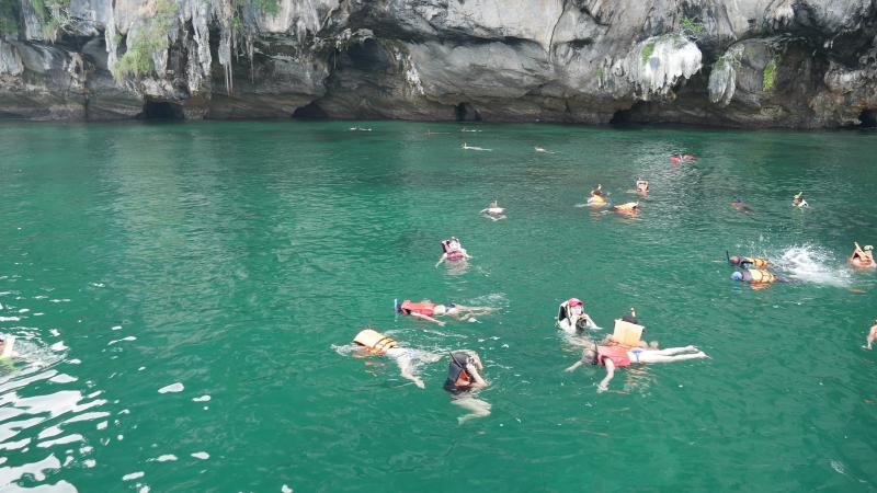İlk olarak Poda Adası’nın hemen önünde bulunan Koh Tan Ming’de duruyor ve şnorkelle yüzme şansı buluyorsunuz. Suyun altı muhteşem görüntüler, enfes renkte mercanlar ve tropik balıklarla dolu. Tekneler herkese tura başlarken birer adet şnorkel ve gözlük veriyor, dönüşte de bunlar numaralarına göre toplanıyor. Tamamı turun fiyatına dâhil. Koh Tan Ming’de suyun altında çekim yapabilecek bir fotoğraf ya da video düzeneğine hazır olmanızı öneririm. Eğer su altı çekim yapabilen bir kameranız ya da kameranızın su altı koruma düzeneği varsa mutlaka yanınıza alın. Eğer yoksa da Krabi’nin içindeki küçük dükkânlardan dahi yaklaşık 10 dolara temin edebileceğiniz su korumalı cep telefonu veya başka küçük eşyalarınızı koyabileceğiniz, boyna asılan şeffaf torbalardan alabilirsiniz. Bu torbalar suyun altında fotoğraf ve video çekmek için cep telefonunuzu ya da küçük kameranızı kullanmanıza izin veriyor ama iyice kilitlediğinizden emin olun : )