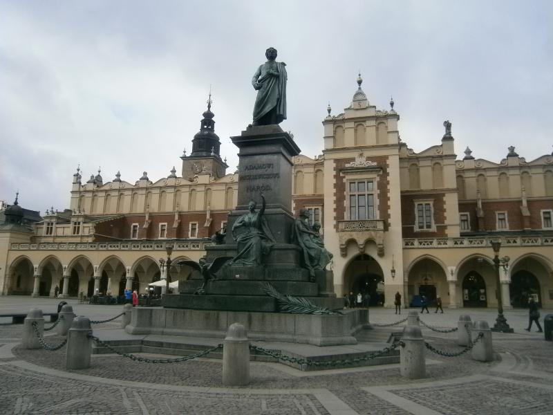 Avrupa'nın bu en büyük meydanının ortasında, yapımı 13. yüzyıla dayanan, Kumaş Pazarı Binası (Sukiennice) bulunmakta. Katedral ile Sukiennice arasında Polonya'nın en önemli şairlerinden olan Adam Mickiewicz'in Heykeli (Adam Mickiewicz Monument) bulunmaktadır. İstanbul'da yaşamının son dönemini geçirmiş olan şair, Beyoğlu semtinde, Serdar Ömer Caddesi, Tatlı Badem Sokak 23 nolu binada oturmuş ve yine üç katlı bu binada gözlerini kapamıştır."Polonya'nın, komşu düşmanlar tarafından ezilmesine hiçbir devletin ses çıkarmadığı günlerde, tek dostumuz Türkler olmuştur. Biz Türkleri düşmanımızın önünde eğilmediği ve Polonya'nın işgalini kabul etmediği için, üstün bir millet olarak severiz." diyen şair, bizim tarihimizde de yer almış ve Beyoğlu'nda yaşadığı ev, 1984 yılında Adam Mickiewicz Müzesi'ne dönüştürülmüştür.