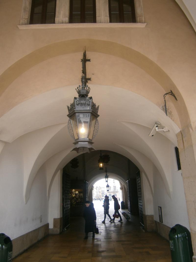 Sukiennice kapısında asılı bıçağı görüp içeri giriyoruz. İçeride özellikle turistlere yönelik eşyalar satan dükkanlar bulunmaktadır.