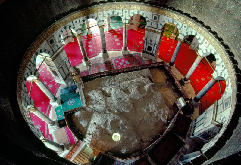 Merkezinde geleneksel olarak dünyanın yaratılmasıyla ve Tanrı’nın insan ile olan akdini başlatan, İbrahim’in İshak’ı kurban etmesi olayıyla ilişkilendirilen gizemli bir kaya parçası vardı. Sonraki dönemlerde Müslüman inanışları burayı Peygamber’in mucizevi gece yolculuğunda göğün yedi katına yükselmesi (Miraç) ile ilişkilendirmişlerdir.