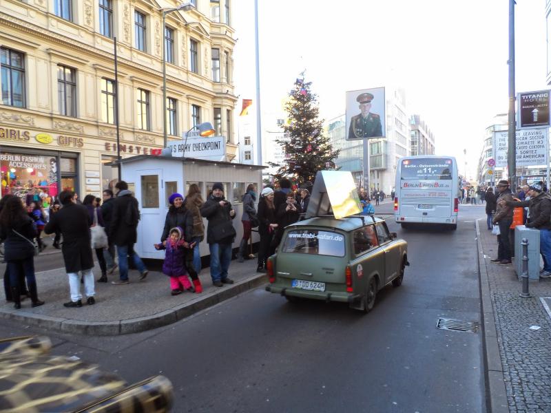 Checkpoint Charlie (Charlie Kontrol Noktası) çok ilginç bir yer aslında. Modern şehrin ortasında geçmişten kalan bir yer. Burası Berlin Duvarının en ünlü geçiş noktasıymış. Duvarın tarihini anlatan müze var hemen yakınında. Hatta duvarın parçalarını, hediyelik eşya satan dükkanlardan almak da mümkün. Checkpoint Charlie vızır vızır akan trafiğin ortasında insanların pasaportlarına visa bastırdıkları, askerlerle fotoğraf çektirdikleri ufacık bir alan. Ama, buranın tarihte pek çok olaya tanıklık etmiş olması; bir insanlık ayıbı olan Berlin Duvarının an an hikayesi, insanı gerçekten çok etkiliyor. Küçük Gezginimiz pek bir şey anlamasa da askerleri görünce bol bol fotoğraf çektirdi.