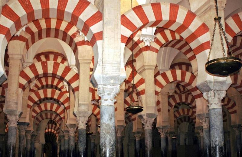 Tavanın yüksek olması bir zorunluluktu ve bu, sütunlar üzerine geniş, kütlesel ayaklar inşa edilerek ve bunlar birbirlerine kemerlerle bağlanarak sağlanmıştır. Kırmızı ve beyaz kemertaşları değişmeli kullanılarak bu kemerlerde bir hafiflik yanılsaması yaratılır fakat alt katmanlardaki hafif ve özgür mekân hissi ile üst katmandaki görece yoğun orman arasındaki tezat açıkça ortadadır. 961 yılından itibaren inşa edilen mihrap çevresinde orman benzeşimi -avludaki, binanın arkadları ile uyum içinde olan ağaç sıraları böyle bir benzetmeyi daha önceden de akla getirir- daha da yoğun olarak ortaya çıkar.