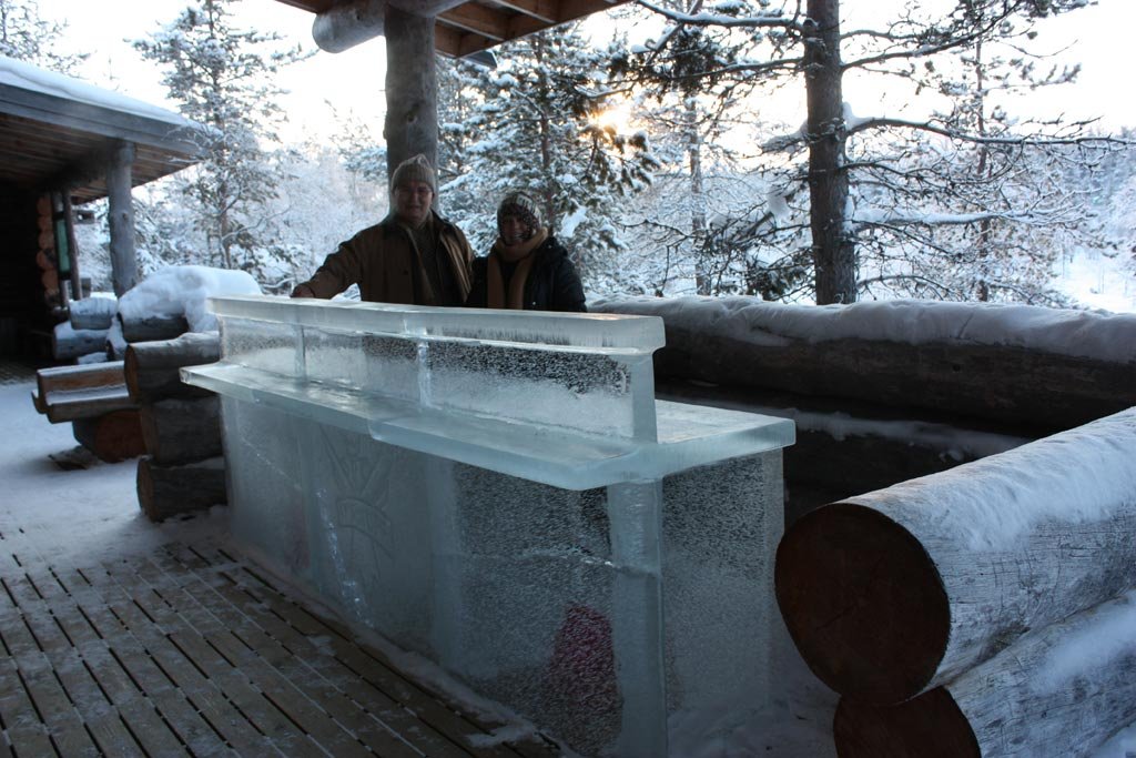 Kahvaltı sonrası Finn Saunasına girdik. Soyunma odası, sauna ve soğuk havuz arasında yaklaşık 15-20 adımlık mesafe var. Finliler bu soğukta tamamen soyunarak önce saunaya sonra soğuk havuza giriyorlar. Tabii biz mayolarımızla -30 derecede o 15-20 adımlık yolu koşarak kendimizi önce saunaya attık. Saunadan sonra buzlu suya girmek biraz fazla geldi. Duşumuzu aldıktan sonra sauna çıkışındaki ufak buz barda birer kadeh içki içmek yerine şömine yanında keyif yapmayı tercih ettik.