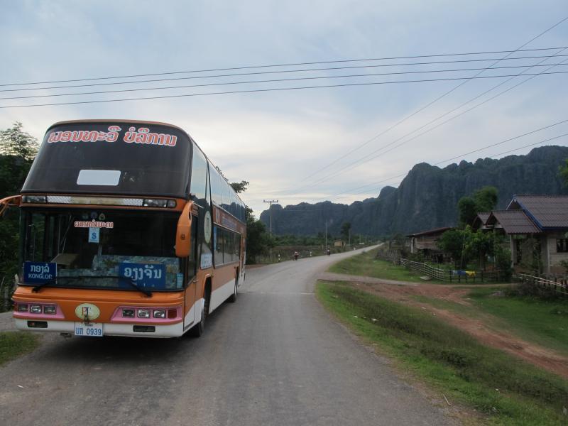 Vientiane’da kaldığımız otel vasıtasıyla bizi Kong Lo Mağarası’nın bulunduğu Kong Lo Köyü’ne götürecek bir turist otobüsü ayarlıyoruz (kişi başı bilet fiyatı 11 Euro). Sabah erkenden yola çıkıyoruz, 6 saatlik yolculuk konforlu ve klimalı otobüs sayesinde çok rahat geçiyor. Otobüs televizyonunun ekranında dönüp duran acılı aşk hikâyelerinin anlatıldığı Laos klipleri en büyük eğlencemiz yine.