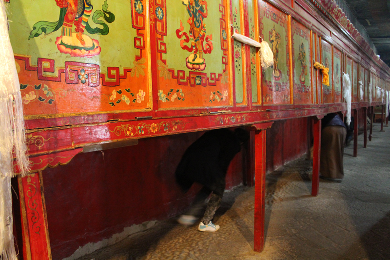 Thangka kutsal kabul edildiğinden, tapınağın içinde bulunan ve Thangka’nın içinde muhafaza edildiği dolap da kutsal kabul ediliyor. Bu nedenle, tüm Tibetliler ve Budist turistler, iki büklüm bu dolabın altından mantralarını okuyarak yürüyorlar. Dolabın diğer ucundan çıktıklarında sonda oturmuş mantralar okuyan monk’a da para veriyorlar.