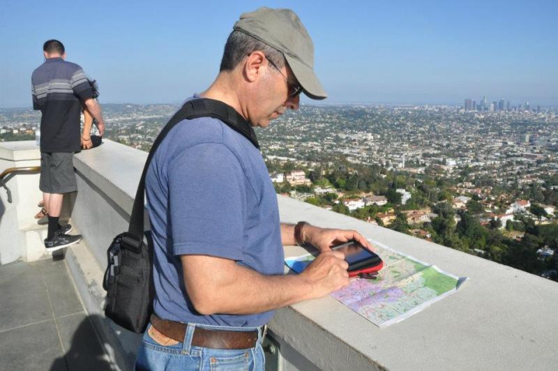 Etem, Griffith Park gözlem evinin terasından otelin yerini tahmin etmeye çalışıyor.