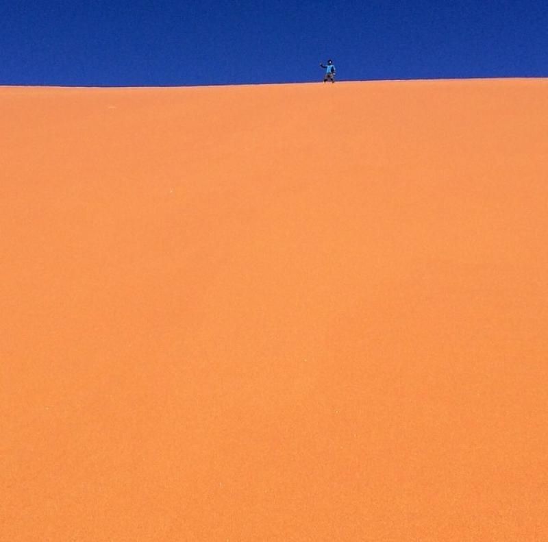 Bu bölge gerçekten sizi başka bir dünyaya alıp götürüyor, büyüleyici bir yer. Benim ikinci gelişim olmasına rağmen 10 kere daha gitsem aynı hissi yaşarım gibi geliyor. Muhteşem turuncu kum tepelerinin ortasında ilerlerken 7 numaralı tepeye tırmanmak için duruyoruz.