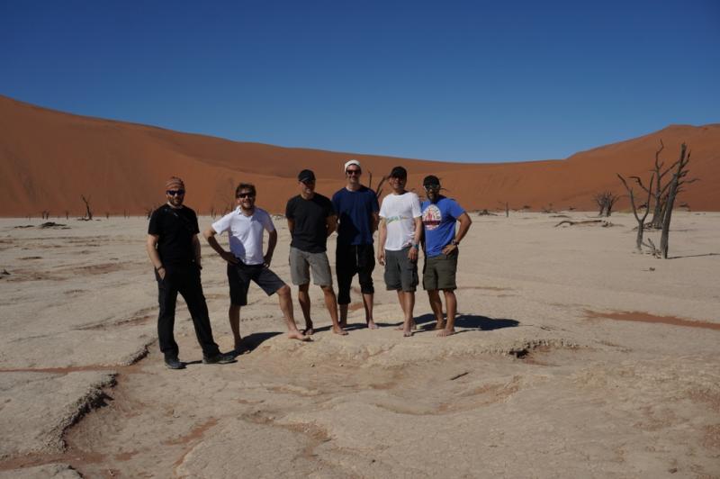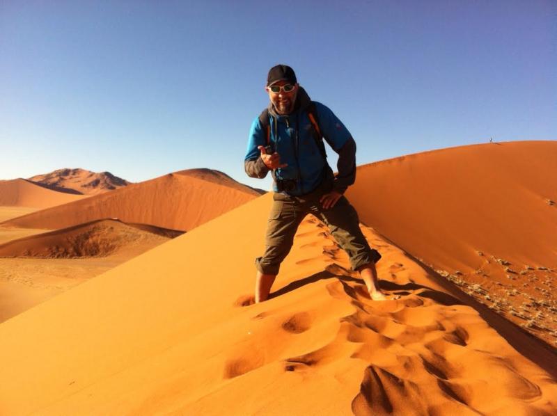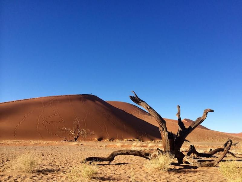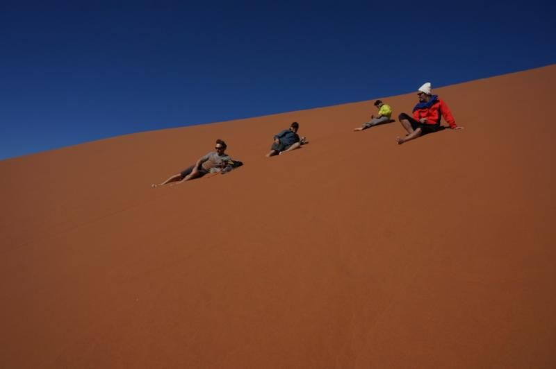 Ayakkabılar çıkıyor ve tırmanış başlıyor. Güneş çok yükselmeden çıkmak gerekiyor, yoksa o enerjiyi bulamayabilirsiniz kendinizde sıcaktan dolayı. Esas keyifli kısım iniş… Dik yamacından aşağı kahkahalar atarak koşuyoruz, bir yandan da kendimizi kameraya kaydetmeye çalışıyoruz, düşüyoruz kalkıyoruz çocuk gibi Namib Çölü’nün keyfini çıkarıyoruz.