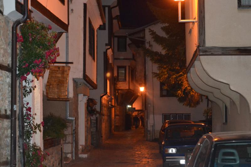 Pansiyona yerleştikten sonra artık hava kararmış ve akşam yemeği saati gelmişti. Gün içerisinde oldukça yorulduğumuz için pansiyonun altındaki aynı işletmeye ait İtalyan lokantasında yemeğimizi yiyoruz. Yemeklerin Makedonya genelinde ucuz olduğunu bir kez daha hatırlatmak istiyorum. Dileyenler yemeklerde Makedonya'nın Tikveş Bölgesi'nde üretilen şarapları tadabilirler. Bu şaraplar aynı zamanda hediye olarak Makedonya'dan alınabilecek en doğru hediyelerden birisidir. Yemekten sonra eski şehri yürüyerek biraz turladıktan sonra pansiyona dönerek istirahate çekiliyoruz.
