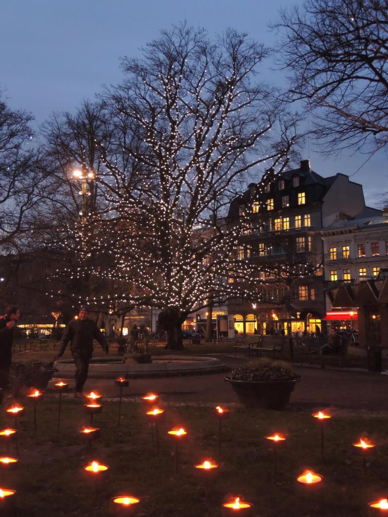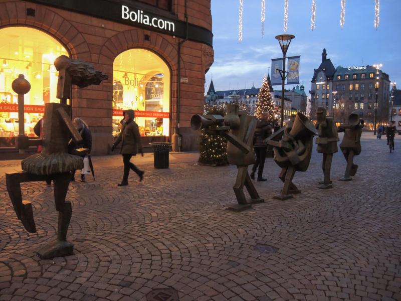 Biraz şehirden bahsedecek olursak, Malmö; büyük metropollerle kıyaslandığında küçük bir şehir de olsa Old Town’u oldukça büyük ve etkileyici, neredeyse kendimi Münih ya da Frankfurt'ta gibi hissettim. Açıkcası tarz olarak, bir Alman şehri havası da var. Meydan, İskandinavya’nın en büyük meydanı imiş. Meydanın orta yerinde Kral 5. Gustav Adolf’un oldukça heybetli bir heykeli var. Tam Noel öncesi olduğu için sokaklar çok renkli ve hareketli. Her yerde büyük çam ağaçları rengârenk ışıklar ile cıvıl cıvıl süslenmiş. Sokaklar Noel şarkıcıları ile dolu. En çok da metal yuvarlak kaplar içinde yakılan mumları sevdim. Hem yerde, hem de ağaç şeklinde inanılmaz dekoratif gözüküyorlar. Meydandan yukarı doğru yürürken sokağın tam ortasında yer alan bronz müzisyen heykelleri çok hoşuma gidiyor, 1985 yılında Yngven Lundell tarafından yapılmış, hava erkenden kararıyor ama ben fotoğraf çekmeye devam ediyorum.