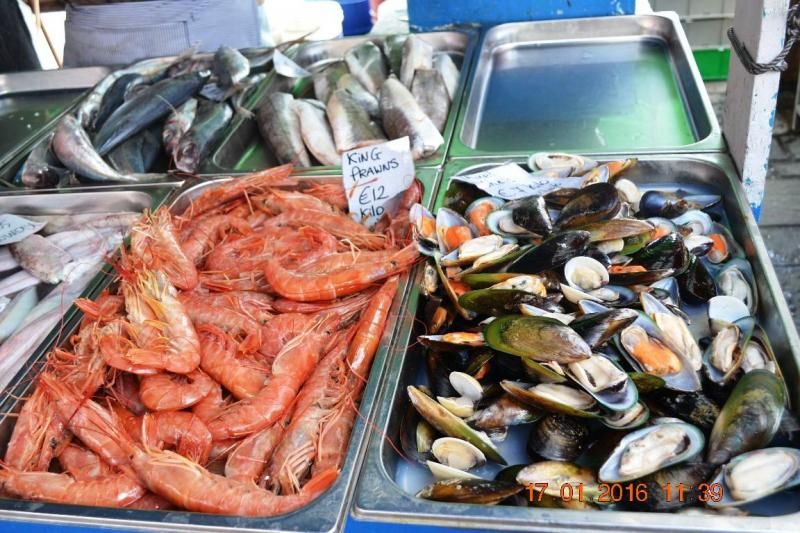 Şanslıyız, bugün günlerden Pazar ve her Pazar sahilde kurulan ‘market’e rastlıyoruz. Çeşitli giyim ve yöresel gıdaların yanı sıra elbette çeşit çeşit balıklar ve her türlü deniz ürünleri de tezgâhlardaki yerini almış. Bazıları oldukça tanıdık olan balıklara bakmak bile iştah kabartıyor, satın almadan sadece bakmak çok zor oldu : )