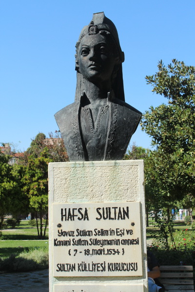 Ardından kentin en önemli yapılarından biri olan Sultan Cami ve Külliyesine ulaşıyorum. Bu cami Kanuni Sultan Süleyman’ın annesi Ayşe Hafsa sultan tarafından yaptırılmış. Bu nedenle caminin bulunduğu park içerisinde Hafsa Sultan’ın büstü yer alıyor.