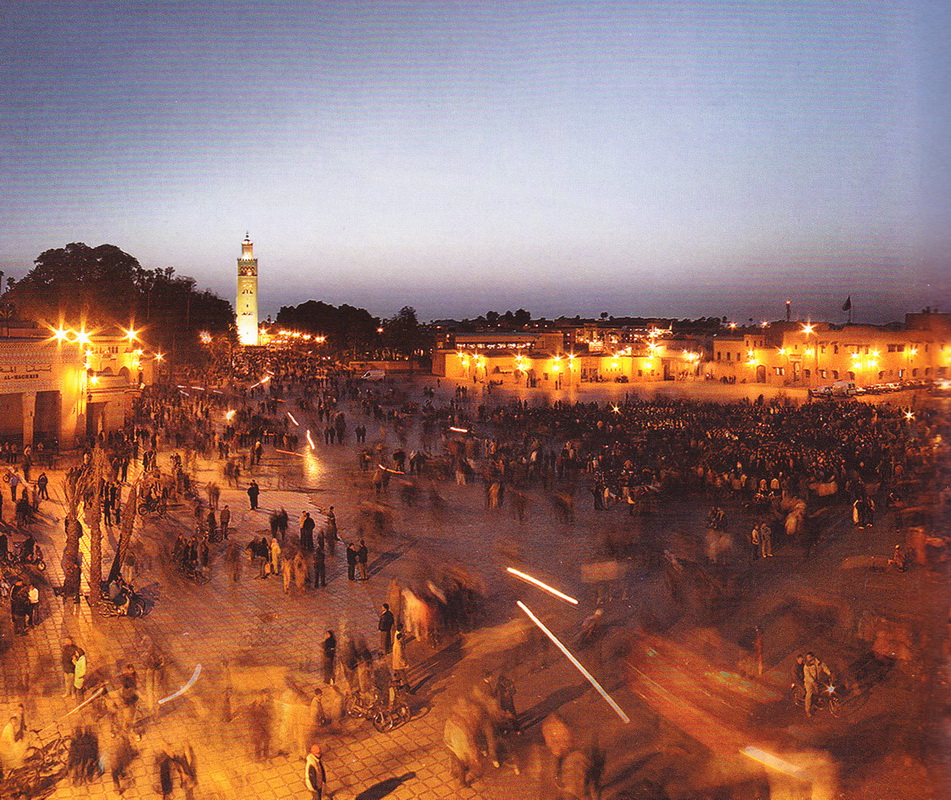 Akşam saat 18’den itibaren meydana seyyar lokantalar kuruluyor. Izgaralarda kebaplar, köfteler, sosisler pişiyor, et kokuları ve göğe yükselen dumanlar meydanı dolduruyor. Halk tıklım tıklım. Her yanda meddahlar, hikaye anlatıcıları, seyyar satıcılar, akrobasi ve dans gösterileri, dövmeciler. Her yer ışıl ışıl. Tam bir film seti gibi. Su satıcıları renkli kocaman başlıkları ve kıyafetleri ile meydana renk katıyor.