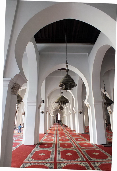 Uzatmadan caminin içine dalıyoruz. Şunu söylemeliyim, ne Ortadoğu’daki gibi yan gelip yatan insanlar var, ne de İran camileri gibi cemaat hasreti çekiyor. Gerçekten içinde ibadet eden insanlar var. Garipseyerek bakıyorlar ama üstelemiyorum. Genelde önlerinden biri geçipte namazları bozulmasın diye çok sayıdaki duvarın ya da ayağın arkasında namaz kılmayı tercih ediyorlar. İç dizayn güzel. Gitgide küçülerek zarif bir perspektife meydan veren pervazlar çok hoş. Kimi ayakların tepesinde malzemeye gömülü, mermer sütun başları var ki bunları tam anlamıyla kavrayamadım.