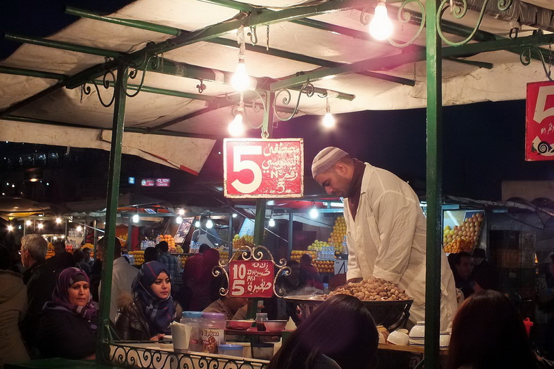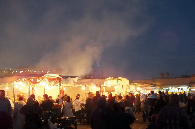 Fnaa Meydanının girişinde indiriyor bizi. Meşhur meydanda amaçsız bir kalabalık var şimdilik. Henüz bir hareketlenme oluşmamış. Hayalim meydanı gören bir oda bulup anlatılan o görüntülere şahit olabilmek. Girdiğimiz ilk otelin geceliği adam başı 6 euro. Fakat meydana bakan odanın camı tahtalarla kapatılmış. Şam’da kaldığım mezar odası gibi yerden sonra çekemem doğrusu. Hiç bir şey görmeden, zifiri karanlıkta, dışarıdaki şuursuz kalabalıktan gelecek ses eşliğinde uyuyabileceğimi pek sanmıyorum. Çıkarken resepsiyonundaki kadınlar gerilerdeki başka bir otelden bahsediyorlar ama planlarım çok çok başka.