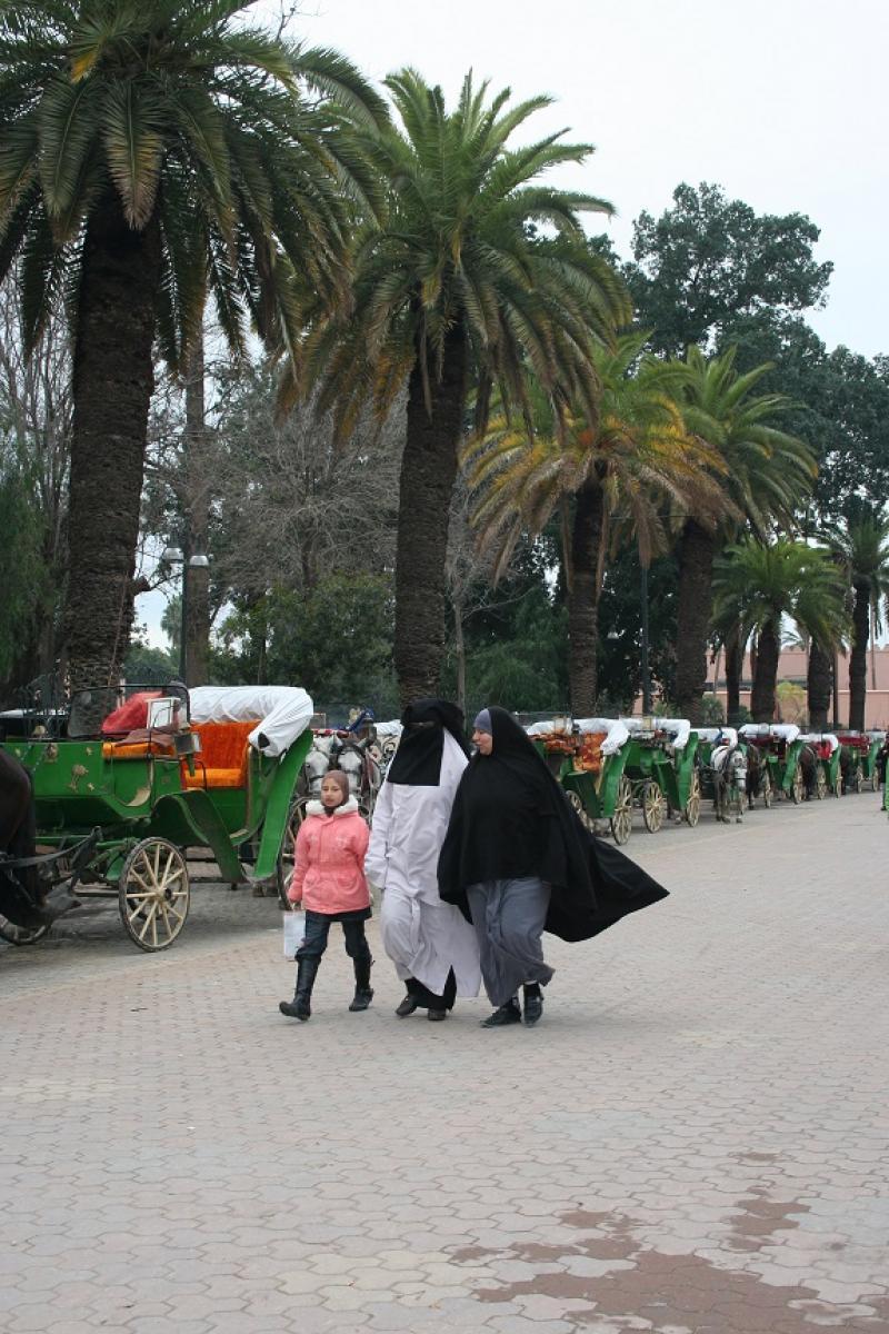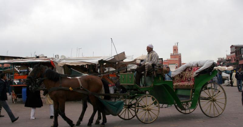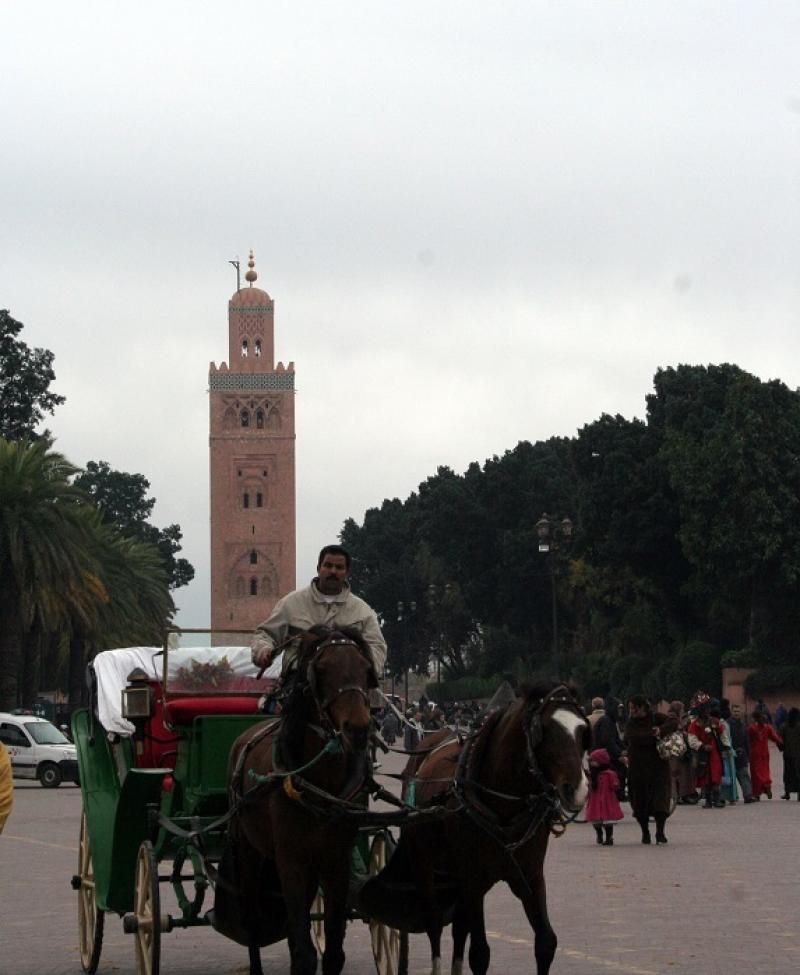Caminin hemen yanında trafiğe açık bir meydan var ve bu meydanla Jama el Fna meydanı arasındaki ağaçlı yolun bir kenarında faytoncular sıralanmış. İster binip etrafı dolaşın isterseniz onların fotoğraflarını çekin. Jama el Fna meydanı ve arkada görülen Kutubia Cami minaresi arada yerel kıyafetli insanlar ve faytonlar Fas fotoğraflarının ve hele hele Marakeş fotoğraflarının vazgeçilmezleri…