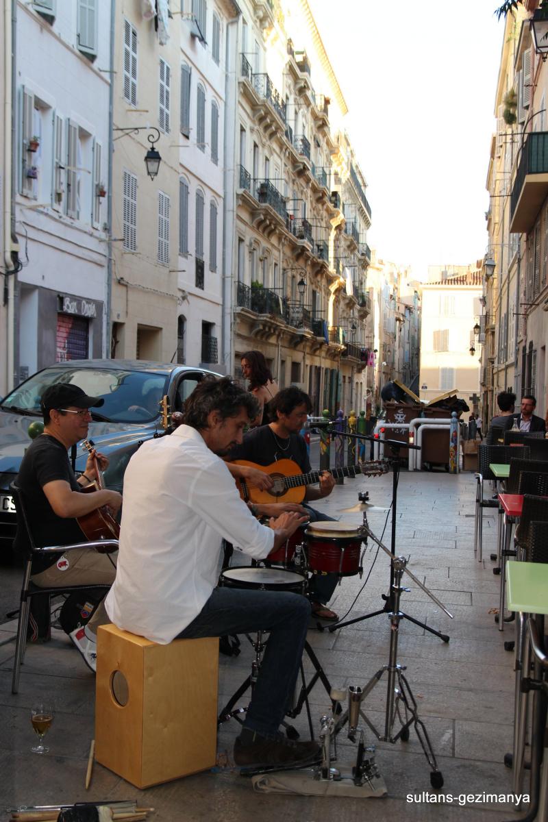 Sonra hemen karşıdaki Belediye Binası’na yöneldim. Bir fotoğraf sergisi varmış. Onu gezdim. İlginçti… Deneysel bir çalışma. İki fotoğraf alt alta… Üstteki fotoğraf orijinali alttaki ise işlenmiş… Cam boyama gibi… Sonra müzik sesini, hoş Fransız şarkılarını (chanson) duyup arka bahçeye yöneldim. Sahnede bir erkek sanatçı şarkı söylüyor. Sıra sıra dizilmiş sandalyelerin hepsi dolu. Yaşlı, genç, şık, kadın ve erkekler… Ben de arka sıraya geçip ayakta biraz dinledim. Sonra boş bir sandalye bulup oturdum. Meğer bu aktivite, yerleşmek için Marsilya’ya yeni gelenlerle kaynaşmak amacıyla düzenlenen geleneksel bir kokteyl imiş. İkinci erkek sanatçı da bir şeyler söyledikten sonra kokteyl başladı. Anonsla birlikte herkes ikram masasına yöneldi. Burada da durum aynı yani… Bu arada şarkılar devam etti. Özellikle ikinci bölümde söyledikleri opera şarkıları gerçekten güzeldi. Opera eğitimi aldıkları ve çok deneyimli oldukları anlaşılıyordu. Sahne performansları çok iyiydi. Ama pek çok insan yeme-içmeyle ilgili görünüyordu. Benim içinse sürpriz bir müzik ziyafetiydi. Elbette sonuna kadar değerlendirdim."La Chante mi cantare”ye eşlik ettim. Öyle ki birileri İtalyan olup olmadığımı bile sordu. Bu da günün geyiği idi… Bu şahane konserden sonra Eski Marsilya olarak adlandırılan Panier (“Sepet” demekmiş) sokaklarında dolaşmaya başladım. Haritasız, herhangi bir yeri aramadan, plansız dolaşmak güzeldi. Bir kafede Latin bir müzik grubuna rastlamak, bir duvar resminin altındaki gençlerin fotoğrafını çekmek ve bir camda eski bir artistin fotoğrafını görmek güzeldi.
