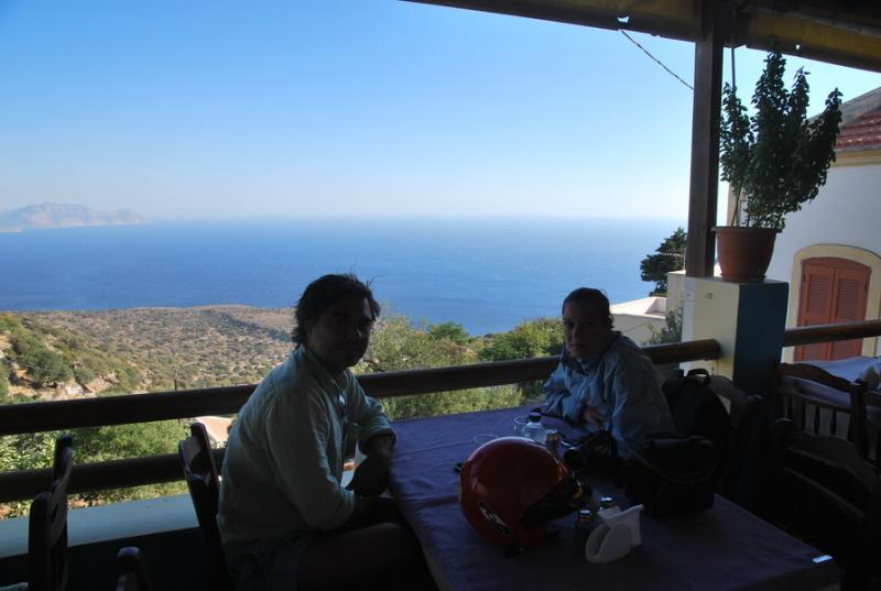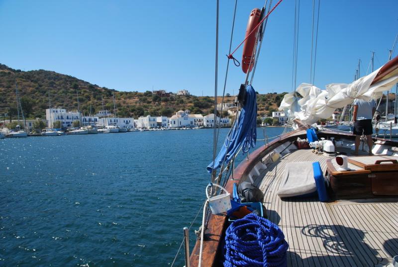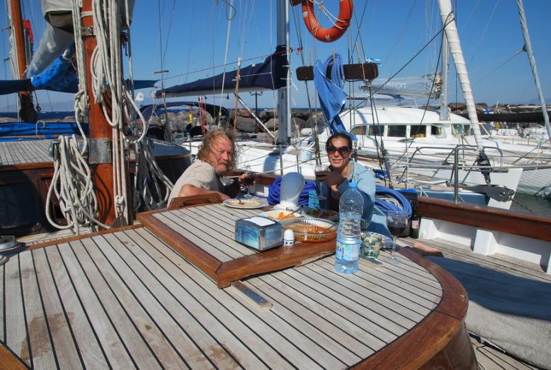Nysiros’taki Pali Limanı'na girince ancak tekne sakinleşti. Ama halen hava çok rüzgârlıydı. Biz de bu gün motorsiklet kiralayıp adayı dolaşmayı düşünüyorduk ama bu kadar rüzgâr olunca belki rüzgâr diner diye öğle yemeğimizi teknede yapalım ve hava durumuna bakalım kararını aldık.